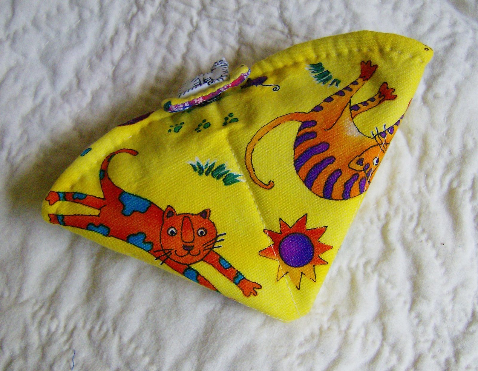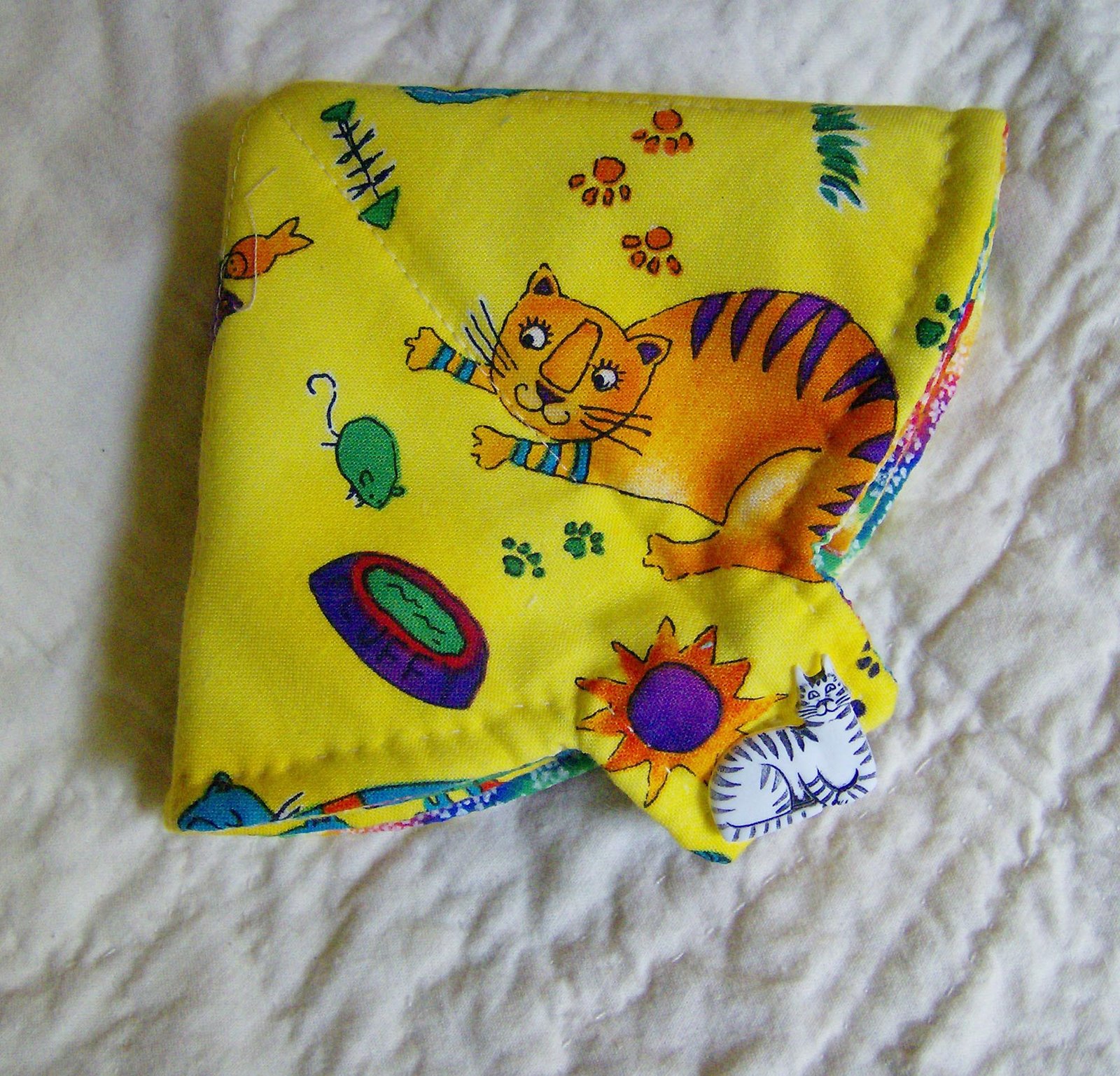 I took Annemiek‘s advice and gave up on the scallops on these little needle cases and made another with this fun kitty fabric, this time made totally by hand. And Annemiek is right — it is much much easier without the scallops! Although I’m still tempted to try sewing one with the scallops by hand.