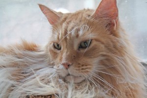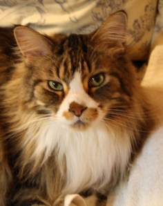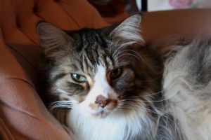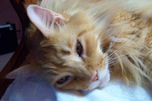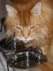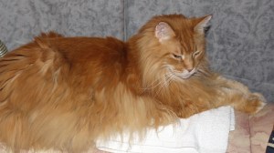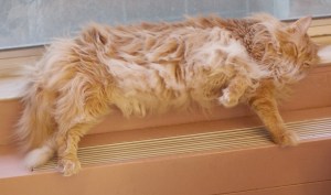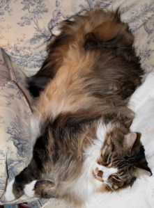 The boys were relaxing after a day of helping Mr. Q.O. celebrate his birthday. If you look closely, you can see that Smudge has been drinking — the fur on his face is still a bit damp.