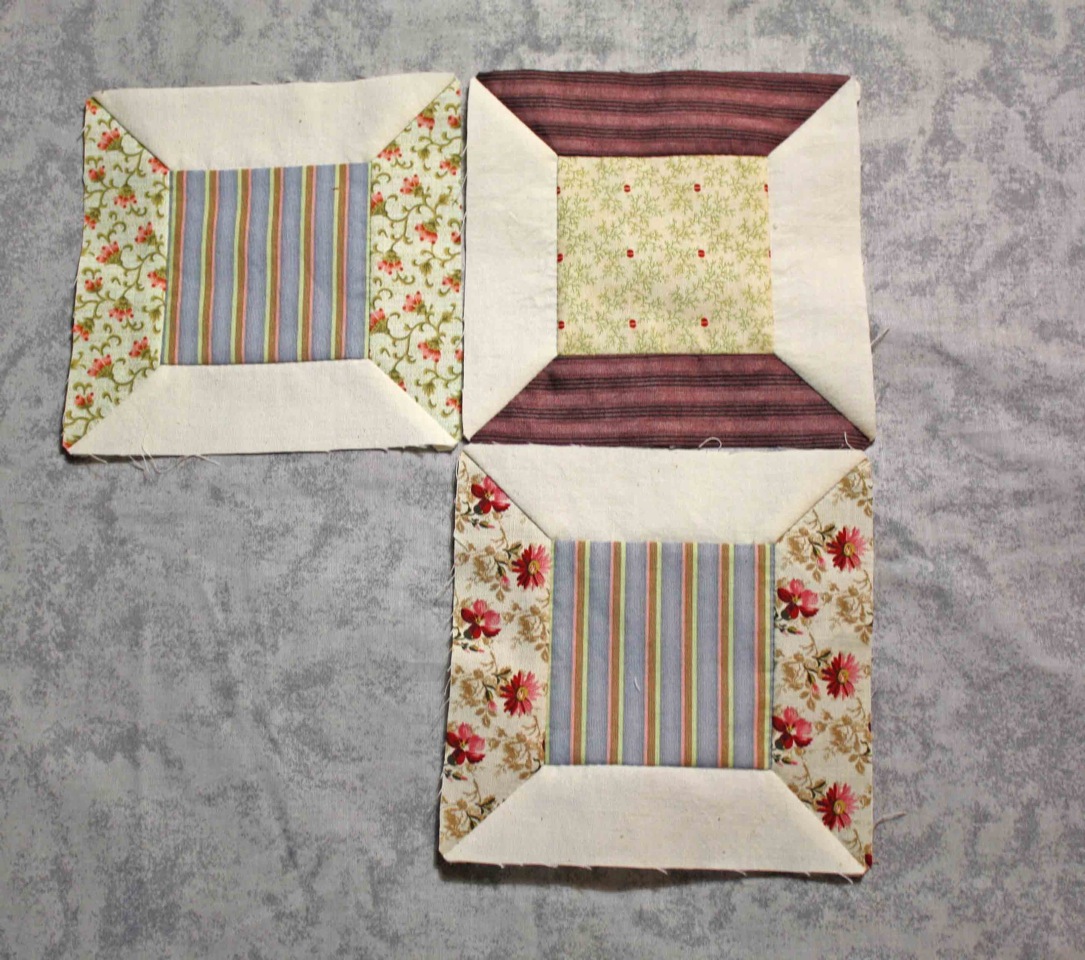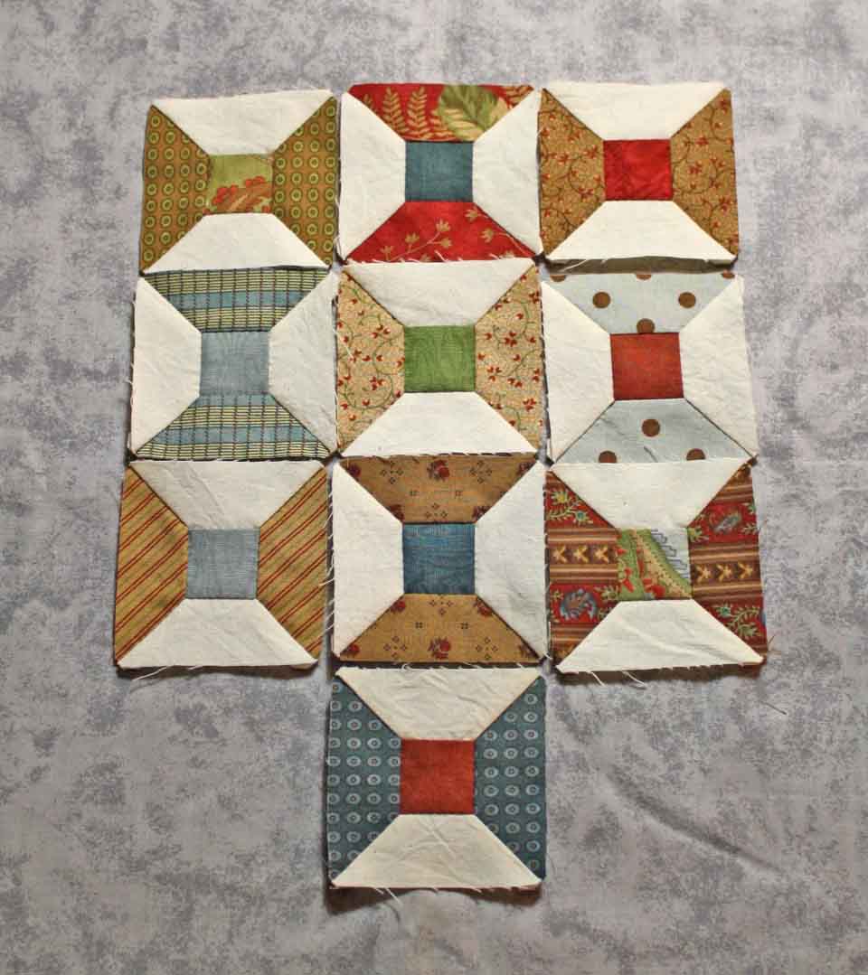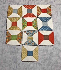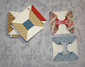 Saturday, after making some of the small spool blocks, I decided I would try some larger ones so printed out the shapes for and pieced a few of them while we watched the Academy Awards last night.