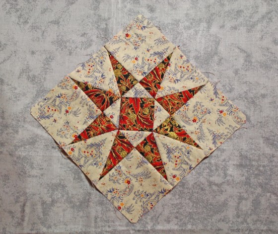 There’s a table runner pattern I’m working on that will feature, among other things, this star.  I made it with the 6″ Storm at Sea collection.  The background fabric I used is one that I’ve had for ages and absolutely love working with.  It’s almost of the same thread count as a good batik but needles so easily.  I’ve been looking for the right pattern in which to use it for years.