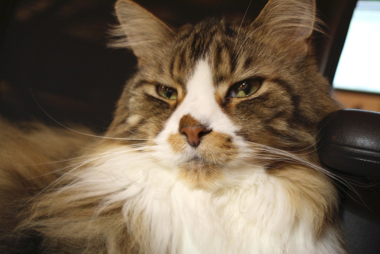 It was a rainy, drizzly, somewhat cooler day on Tuesday and the cats didn’t spend any time on the windowsill.  Smudge did spend a lot of time in my desk chair, though.  It seems to be one of his favourite spots.  I’m not too sure what that look is all about — perhaps a bit of a Morris look.