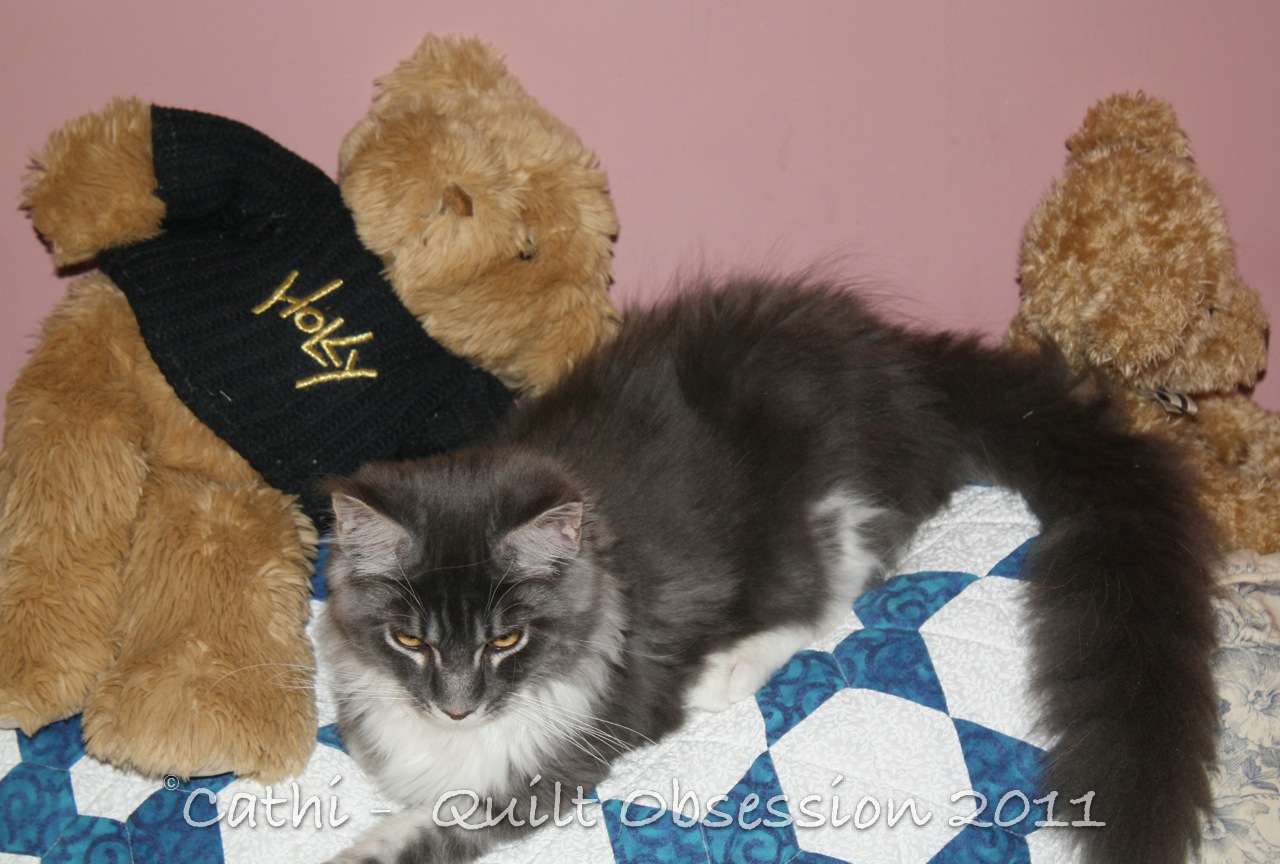 Baxter hanging out on the quilt on the couch with some teddy bear friends.