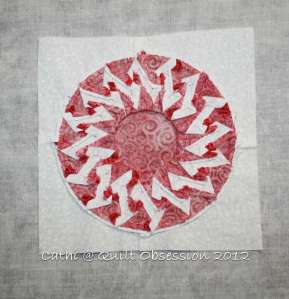 While I’m still waiting for the white on white fabric to finish the Feathered Star/Sunflower blocks, I have enough to get the last two blocks done other than the outside large triangles and squares. So out came the pieces, and I got the sunflower for the second-last block done.
