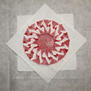 The ring of diamonds and triangles that go around the centre of the second sunflower are done. Once that ring is made, the rest of the piecing of a sunflower block takes no time. I may get the second one finished tonight and the third started.
