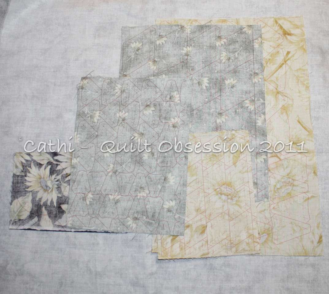 As soon as the collections were released and I had a few minutes to review the Sunflower Design Book , which is absolutely fabulous, I had my fabrics picked out and had printed the shapes for two blocks. The design book is, for now, free and is well worth downloading as it’s absolutely stuffed full of great tips about techniques to stitch a sunflower. If you click on the above picture to enlarge it, you can see the printed stitching and cutting lines and the matching points.