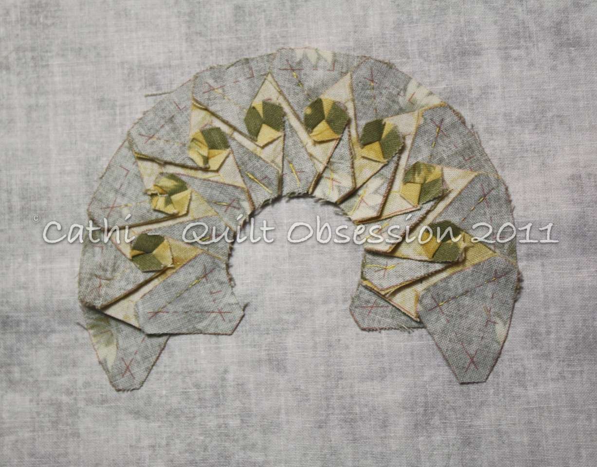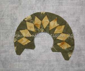 I started making the first of the two circles of diamonds and triangles and can’t wait to play with the design possibilities with other fabrics. The diamonds in this circle are .74″. Lots and lots of continuous stitching possibilities and, of course, curved piecing. I couldn’t ask for anything more. The ideas are just flying through my mind!