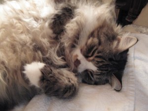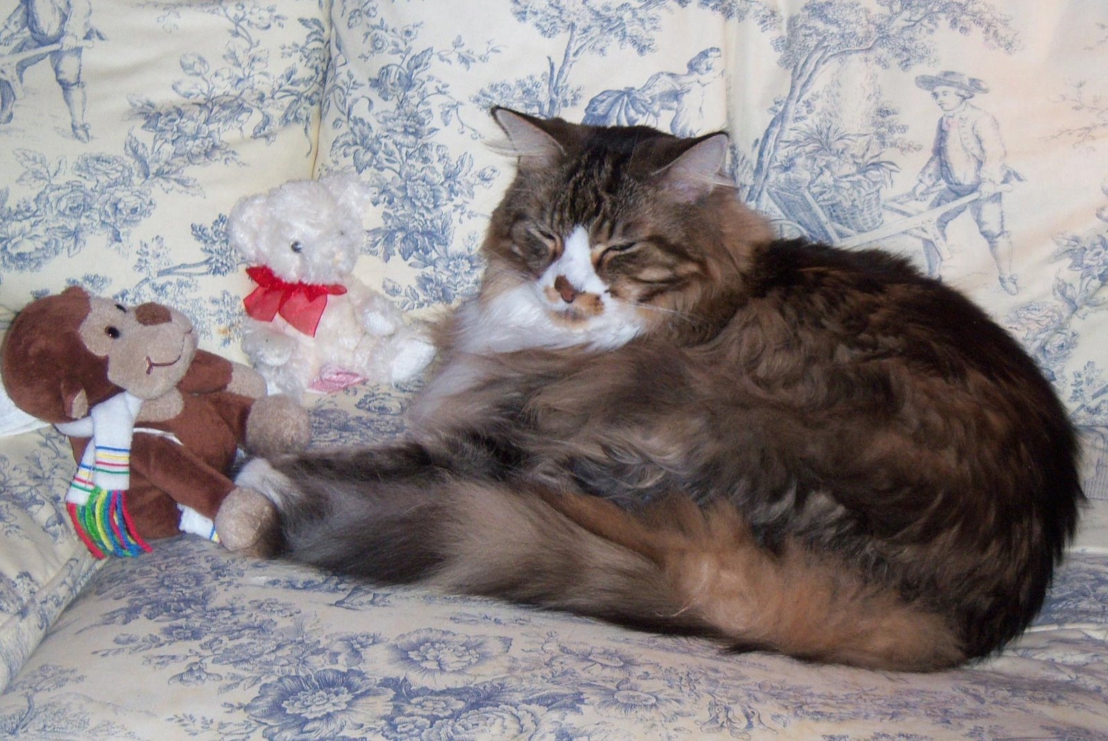 The cats know how to deal with this weather. They curl up and have a snooze. First Smudge was on the couch, curled up with a teddy bear.