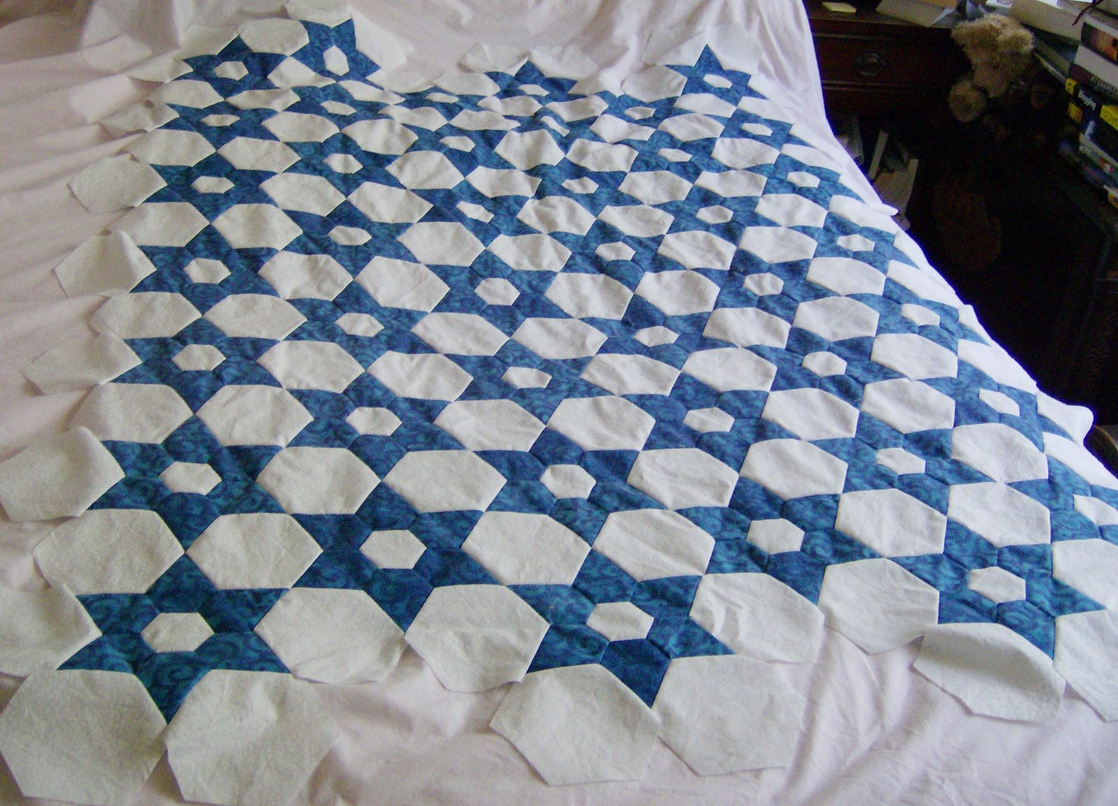 I was asked in an e-mail by Cheryl about the method I use to make these blocks. Sorry, Cheryl — I did try to respond by e-mail but AOL seems to be bouncing e-mails from our ISP. So here goes. I’m hand piecing these, using the templates in the free Inklingo downloadable collection which has all the shapes for this block. The block finishes at 9″.