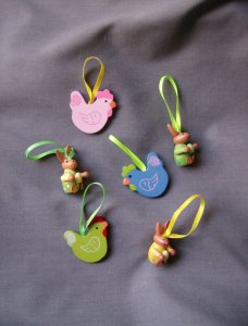 Do you see the feathers in the package in the top photo? Well, the package contains feathers and these little wooden figures — bunnies and chicks. They’re absolutely adorable and are now decorating our wall unit. These will be brought out every year for Easter!