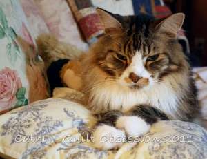Smudge was posing on the top of the loveseat. Mr. Q.O. calls this photo “Quilter’s Cat” because of the quilting paraphernalia visible in the background.